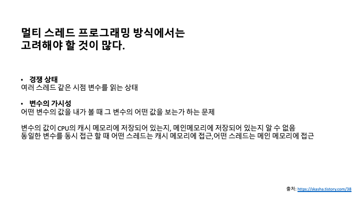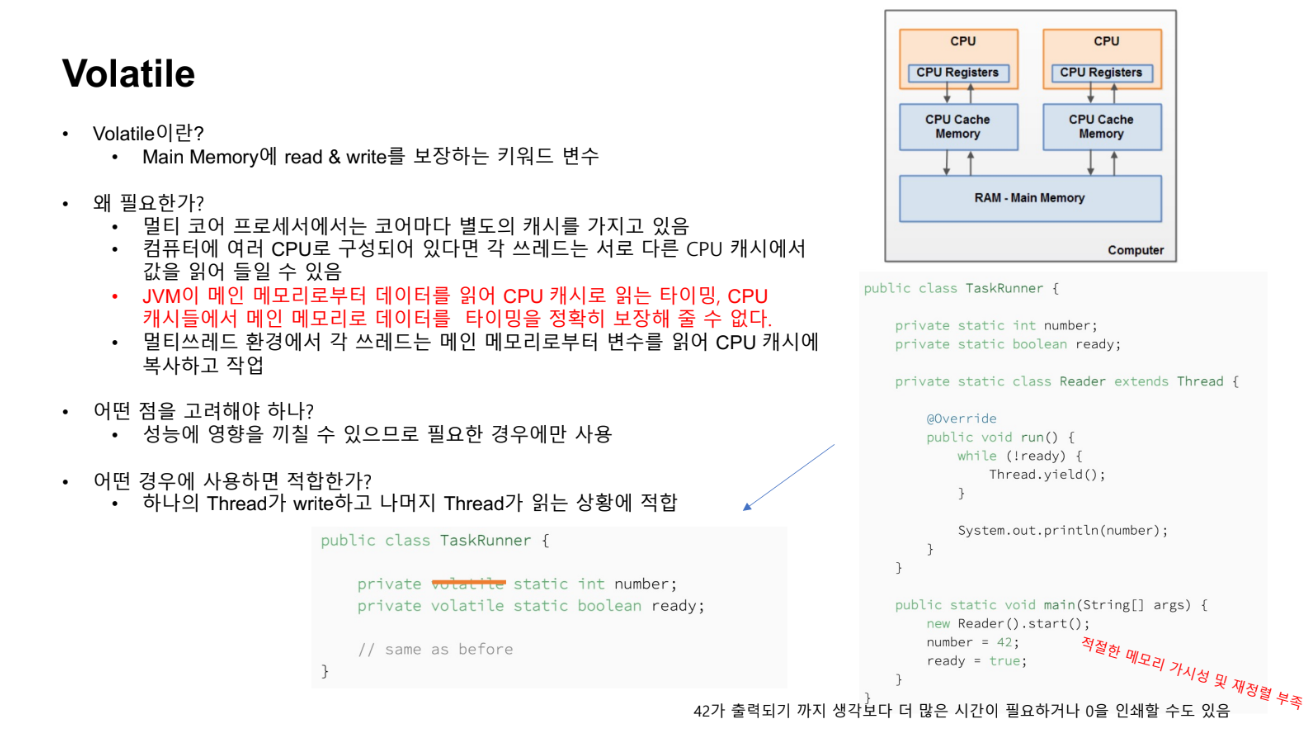 - volatile 키워드는 오직 한개의 쓰레드에서 쓰기 작업을 할때, 그리고 다른 쓰레드는 읽기작업만을 할 때 안정성을 보장