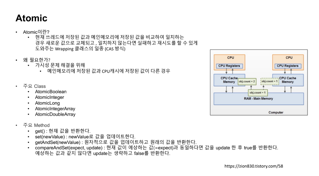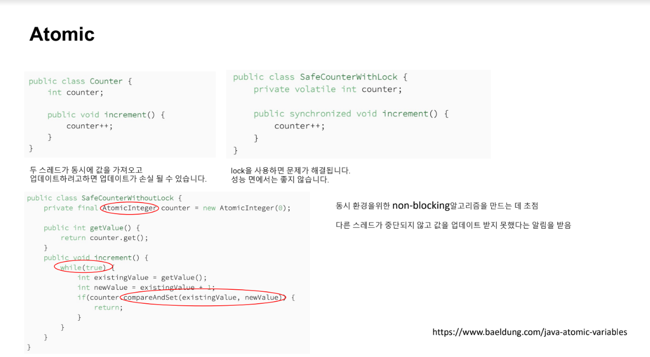 - 여러 스레드가 CAS알고리즘을 통해 동일한 값을 업데이트하려고 하면 그 중 하나가 승리하고 값을 업데이트합니다.