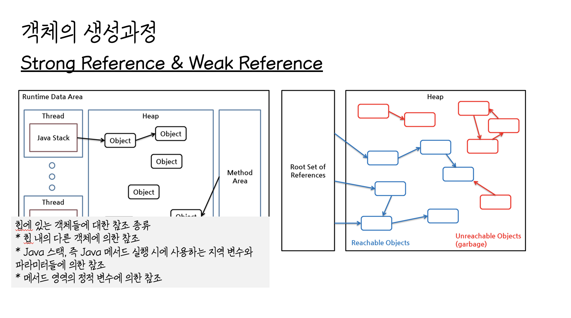 2.Root set으로 부터 시작한 참조 사슬에 속한 객체들은 reachable객체이고 이 참조 사슬과 무관한 객체들이 unreachable 로 GC 대상이 됨