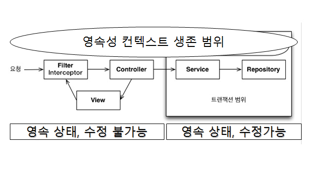 - OSIV(Open Session In View)는 영속성 컨텍스트를 뷰까지 열어두는 기능이다. 영속성 컨텍스트가 유지되면 엔티티도 영속 상태로 유지된다. 뷰까지 영속성 컨텍스트가 살아있다면 뷰에서도 지연 로딩을 사용할 수가 있다.